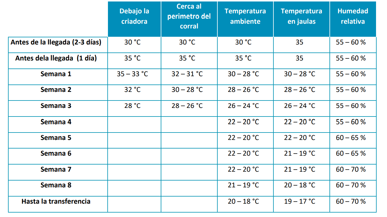 Las pollitas de un día a su llegada deben contar con las condiciones óptimas que les permitan un buen arranque; la preparación de la granja de crianza es el primer paso para alcanzar un buen arranque. El control de la temperatura, humedad y ventilación mínima deben realizarse con cuidado.