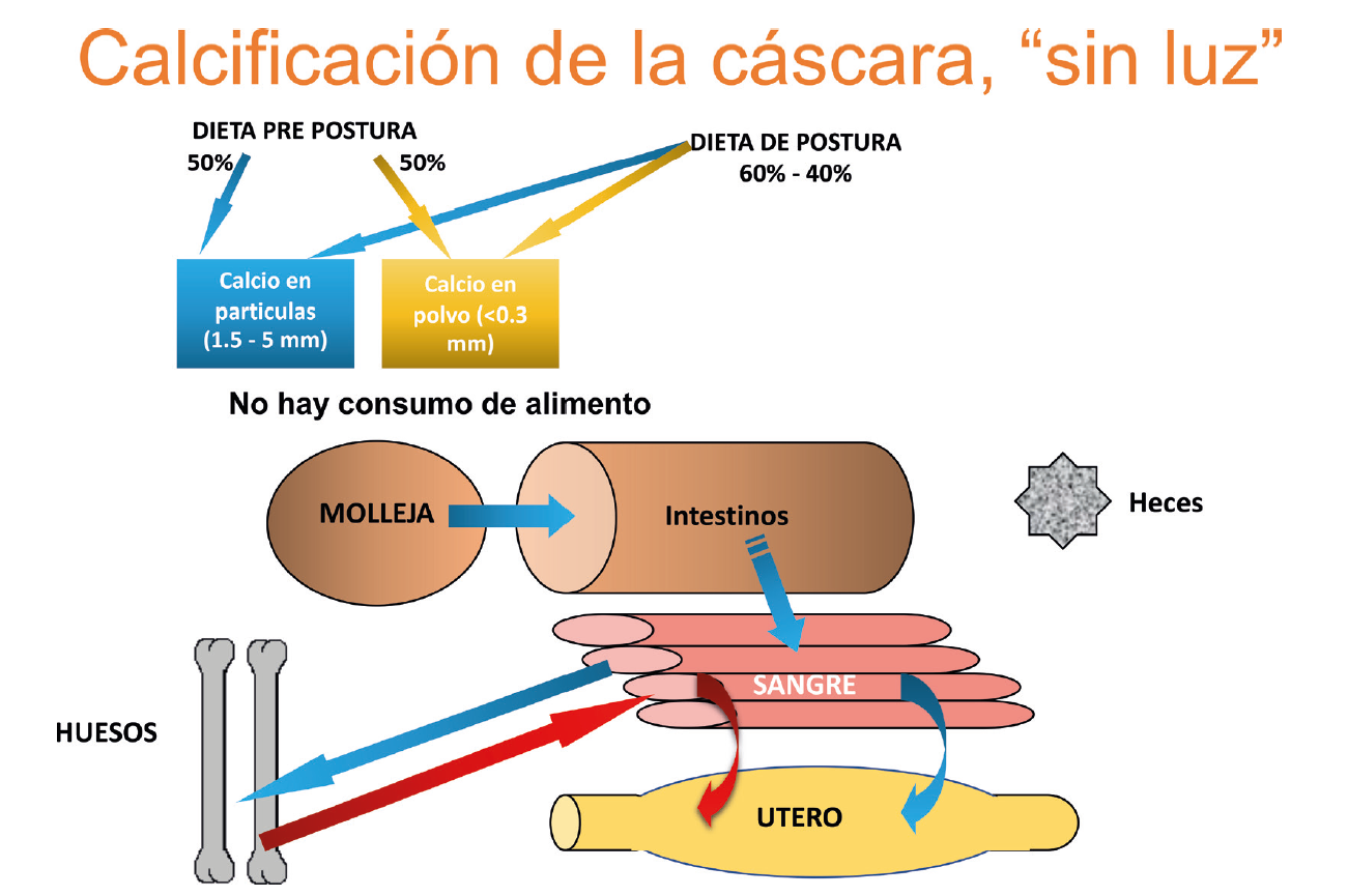incrementar el tamaño de los gránulos de calcio para retrasar la solubilización, o añadir luz a la media noche (si es permitido por regulaciones locales) con el objetivo de proveer al ave suficiente calcio durante el período nocturno (usualmente 8 horas) para asegurar que se mantenga una buena reserva de calcio medular