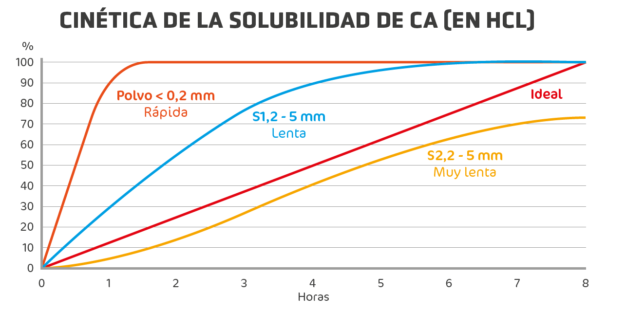 Una vez que la solubilidad cinética ha sido establecida, es solo entonces que se debe ajustar ya sea la proporción de calcio, la relación calcio fino/grueso, el tamaño de partícula o el manejo orientado a optimizar la calidad de la cascara.
