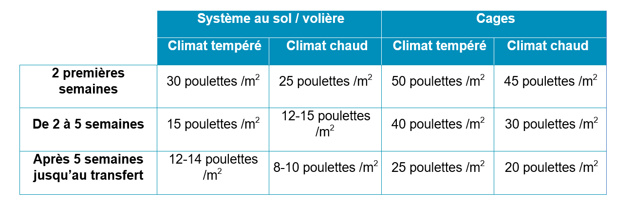 Les recommandations de densité doivent être prises en compte pour assurer un accès à l’eau et l’aliment optimal. Ces recommandations doivent être utilisées comme des lignes directrices ; il peut être nécessaire de les adapter en fonction des conditions locales, du poids des poulettes et de l’uniformité du lot.