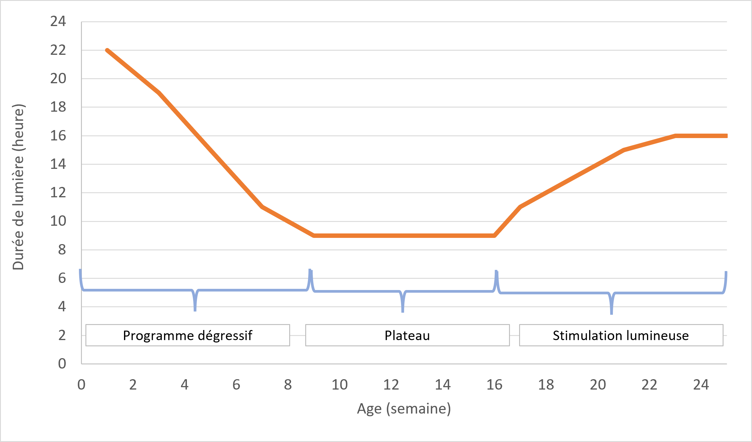 Il n’existe pas de programme lumineux universel : il doit toujours être adapté à la situation. En élevage, le programme lumineux peut être divisé en trois phases, comme le montre le graphique ci-contre: