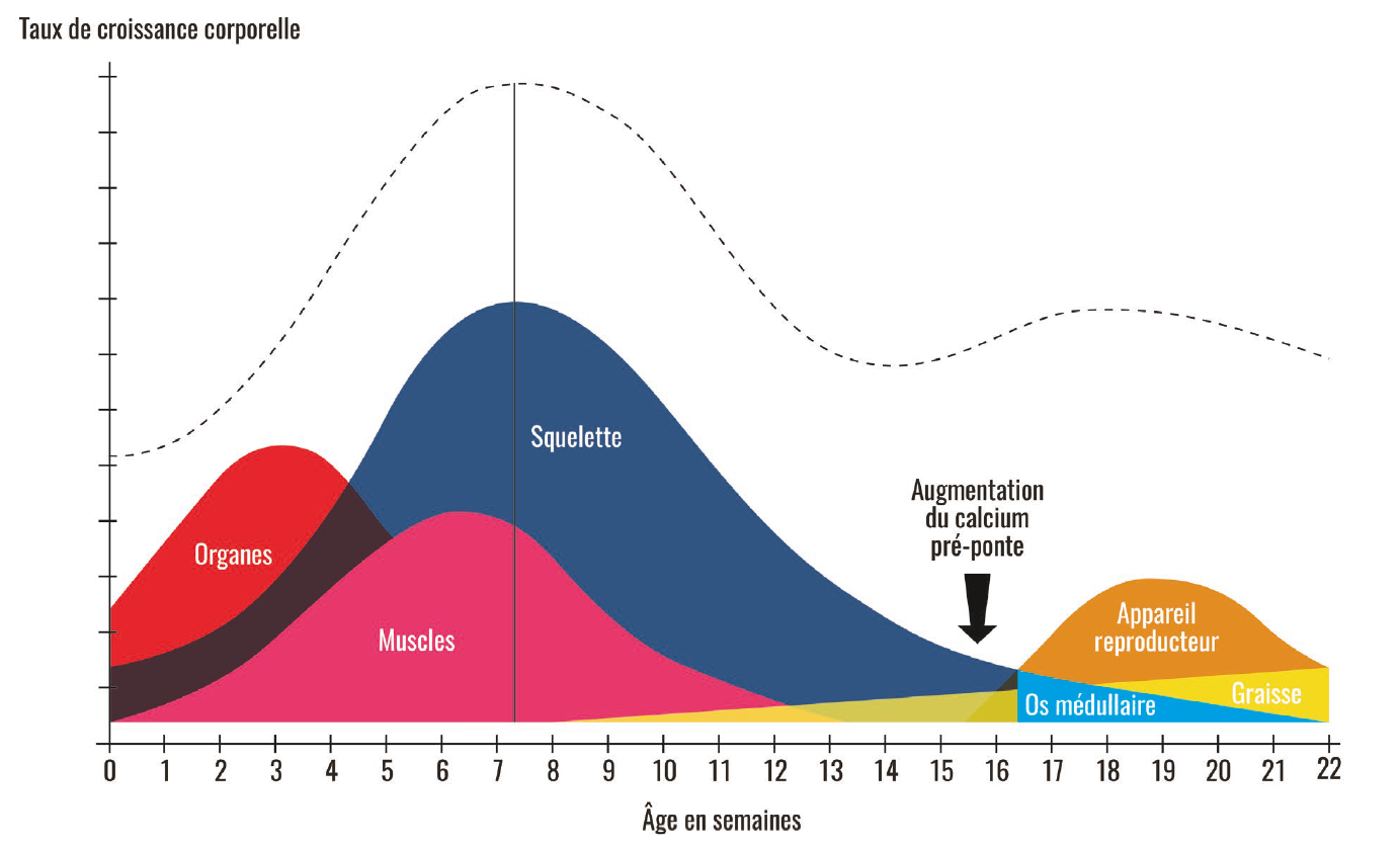 Vers 7 à 8 semaines, les poussins ont déjà développé leur ossature de futures pondeuses, un gain de poids précoce est donc essentiel. En effet, un déficit de poids dans les premières semaines aura un impact négatif sur les futurs performances de la poule. Comme indiqué dans la figure ci-dessous, la plus grande partie de la structure osseuse, les muscles et les organes sont terminés à l’âge de 8 semaines.